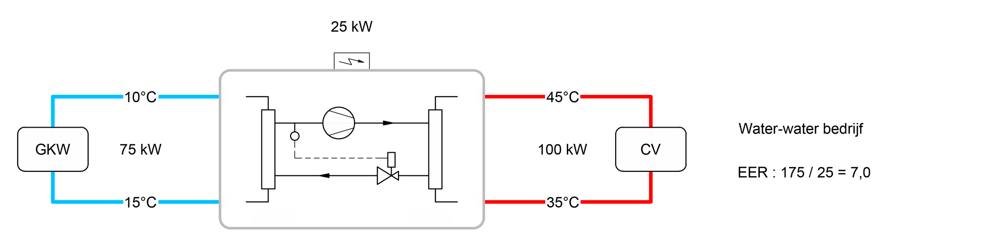 In water-water bedrijf van de warmtepomp wordt de warmte die tijdens het koelen aan het gebouw onttrokken wordt hergebruikt voor verwarming op een andere plaats in het gebouw. Hierdoor wordt de energie aan beide zijden van de warmtepomp nuttig benut, wat leidt tot een hogere rendement.