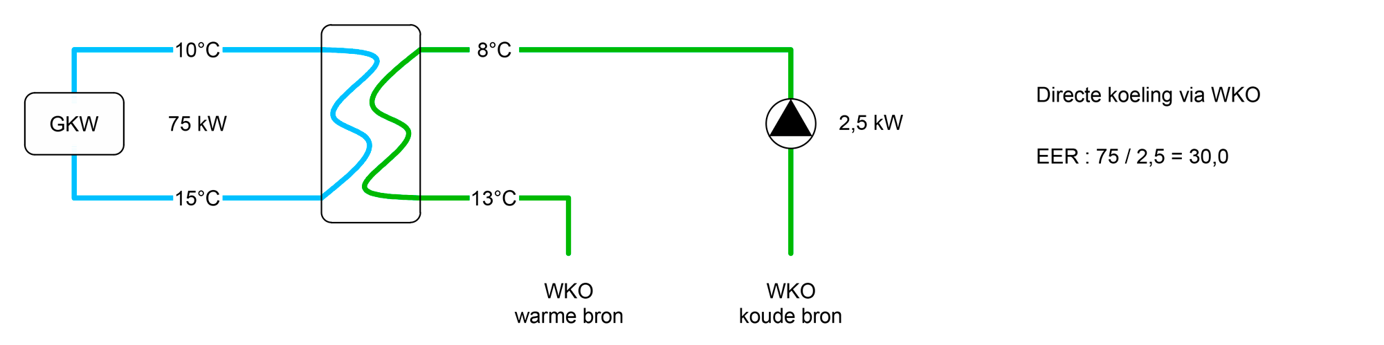 De WKO kan worden toegepast om het gebouw tijdens het zomerseizoen te koelen zonder gebruik te maken van de warmtepomp. Het energieverbruik beperkt zich hierbij tot de circulatiepompen, hetgeen resulteert in een aanzienlijk hoger energetisch rendement.