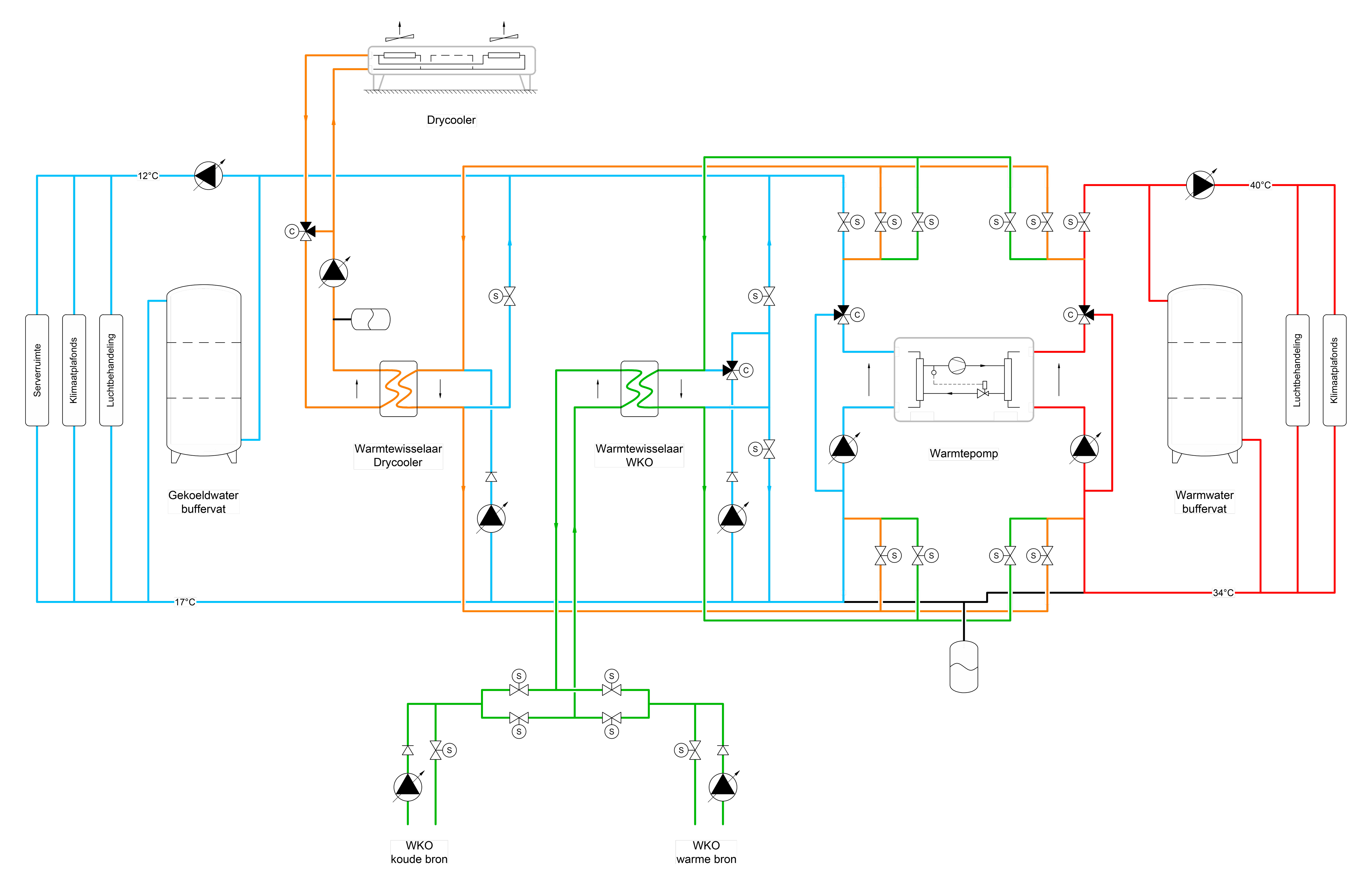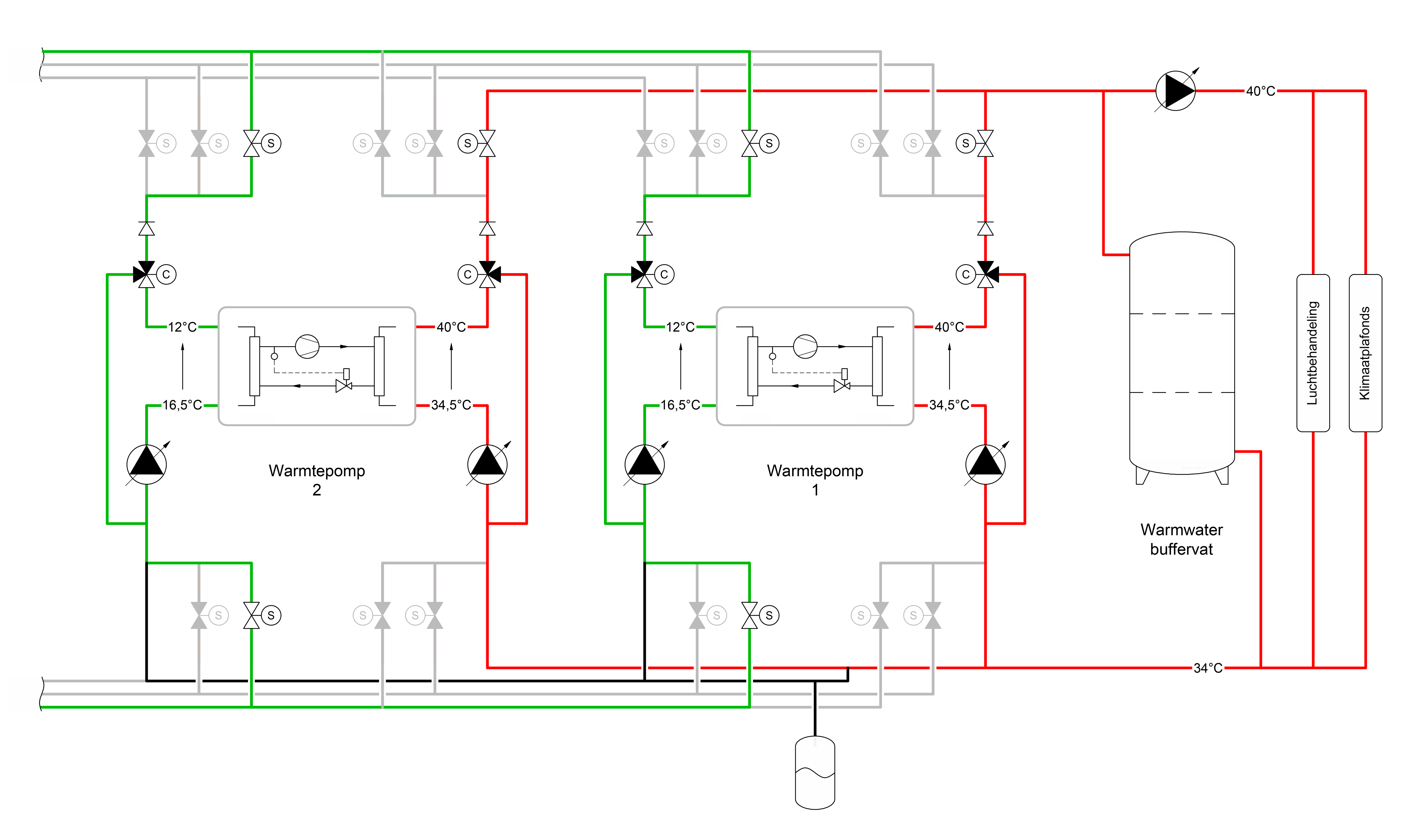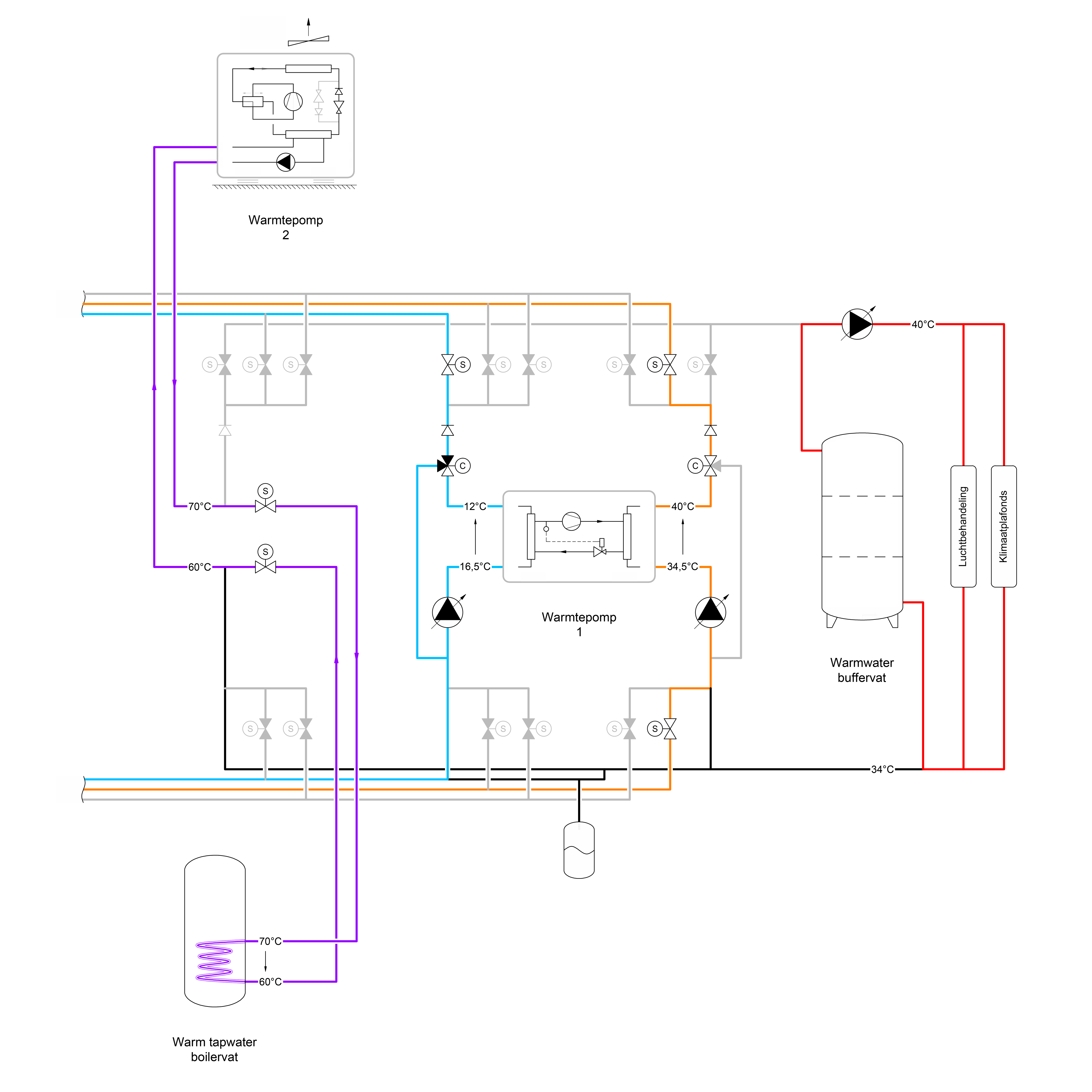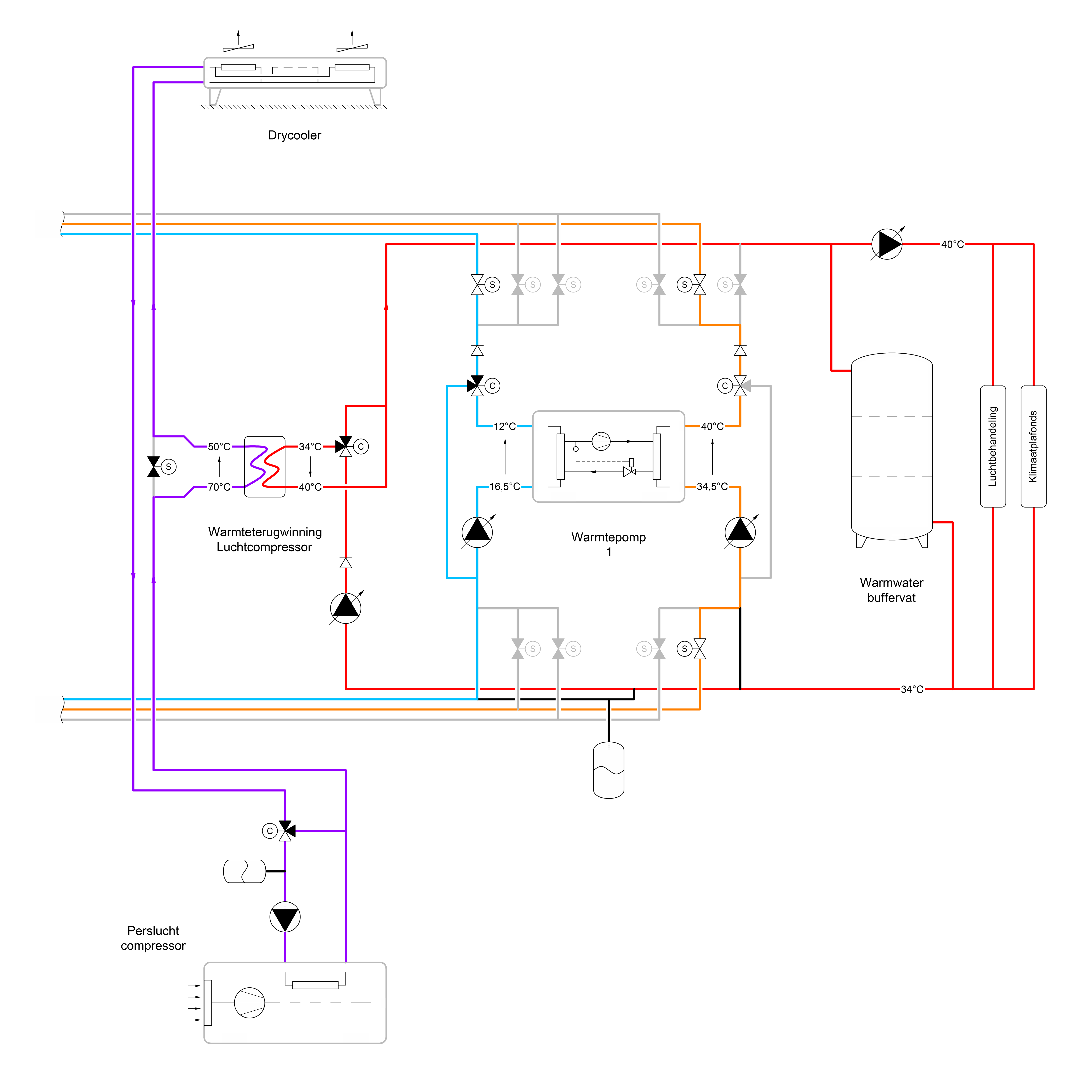 Een en ander zoals op het principeschema hieronder weergegeven en nader toegelicht onder “Warmte- en koudeopwekking”.