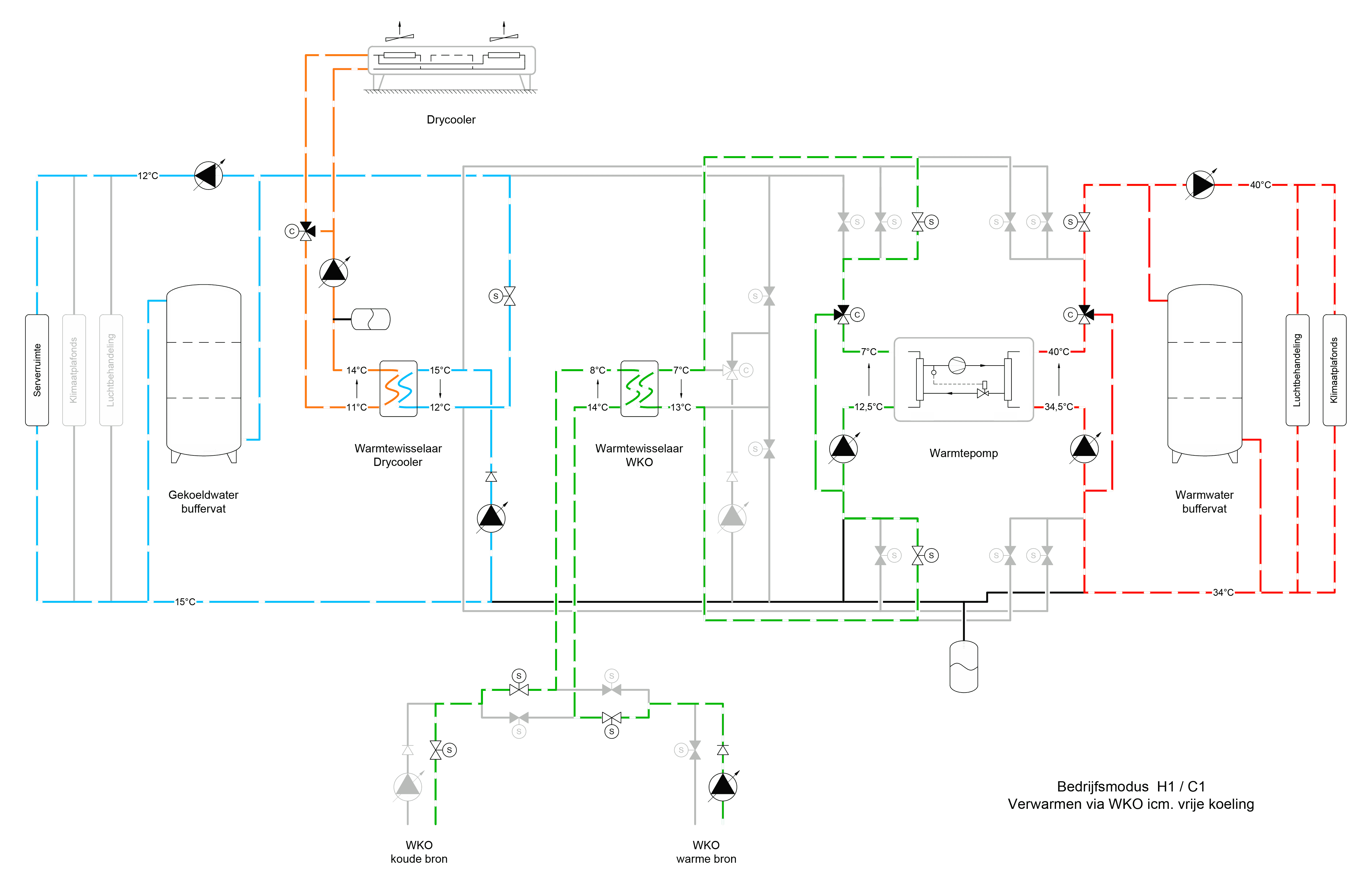 In de winterperiode kan verwarmingsmodus H1 worden gecombineerd met vrije koeling (modus C1). Beide bedrijfswijzes kunnen gelijktijdig functioneren zonder elkaar te beïnvloeden.