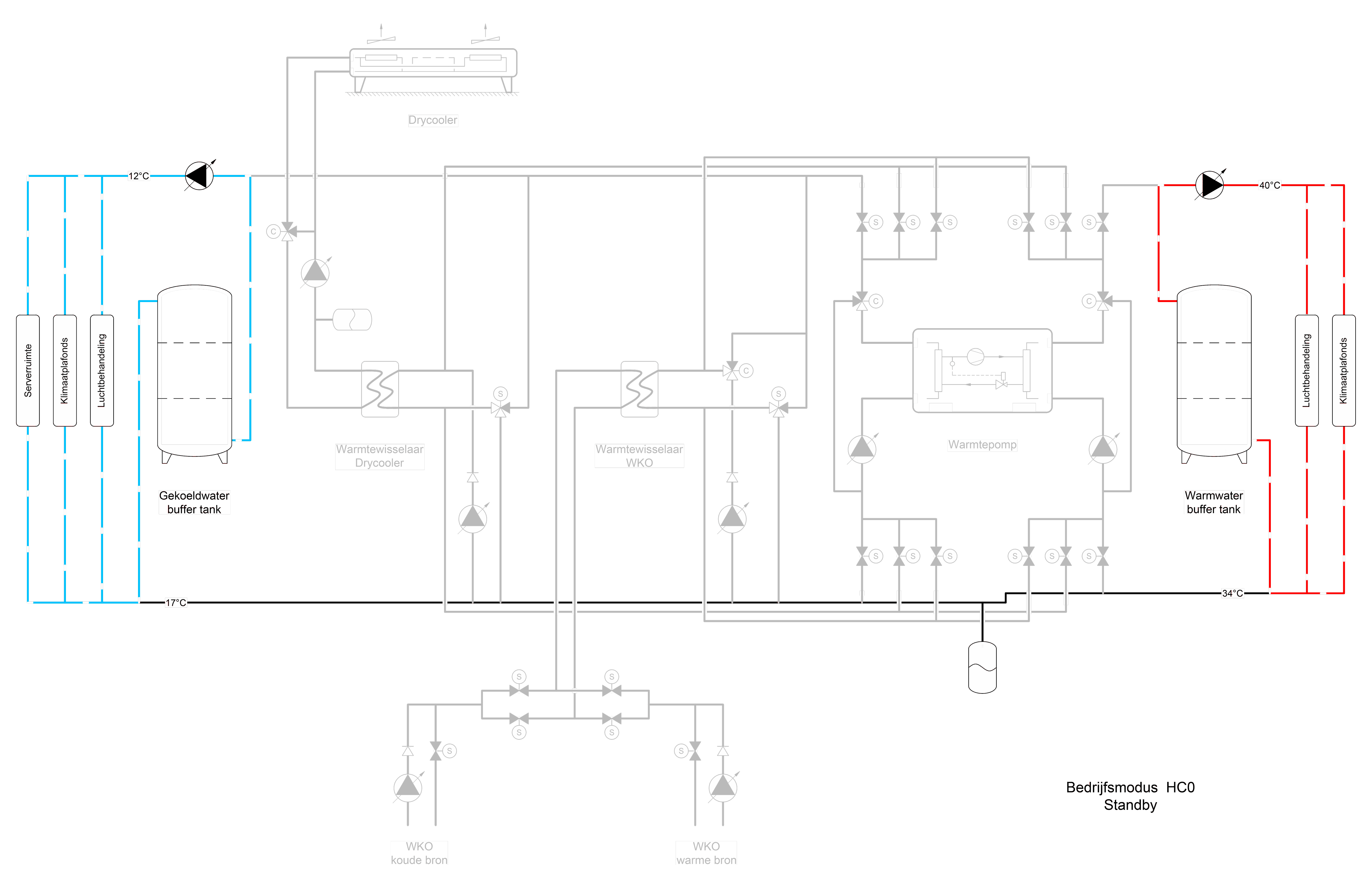 Energiecentrale in rust: geringe warmte- en koelvraag wordt gedekt vanuit de buffers.